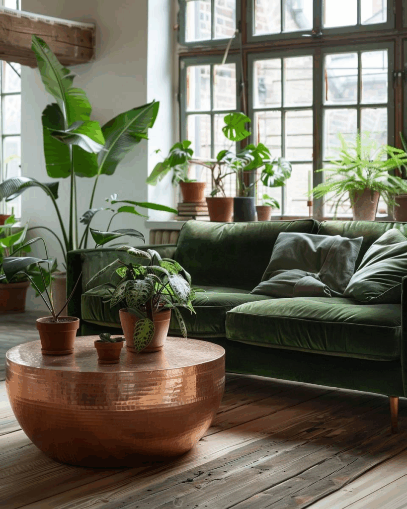 Wähle gedecktes Mintgrün, wenn du Kupfer modern und frisch zeigen willst. Die sanfte Farbe bringt Kupfer richtig zum Glänzen. Mit natürlichen Stoffen wie Holz wirken beide zusammen harmonisch. Dunkle Möbel geben deiner Einrichtung zusätzlich Tiefe.