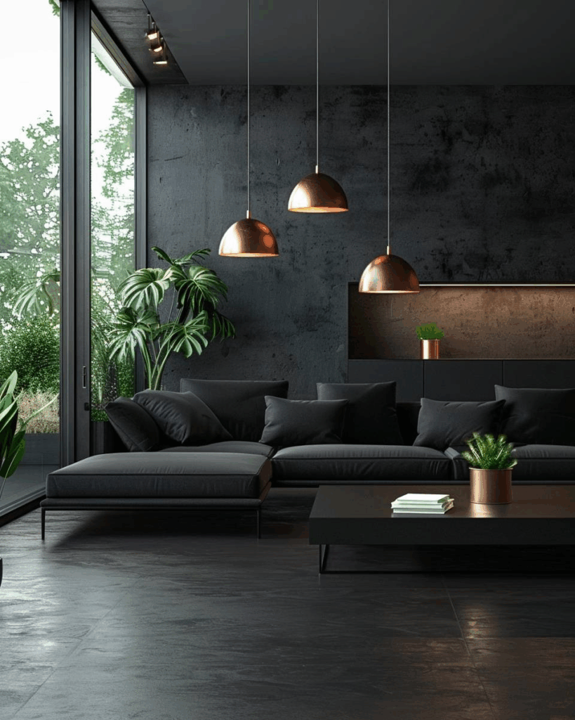 Setze Kopfer mit mattem Schwarz in Szene. Mattschwarz ist unser Favorit, weil es Kontraste schafft und Kupfer modern aussehen lässt. Wände, Accessoires oder Fensterrahmen in Mattschwarz bringen Kupfer zum Leuchten. Nutze klare Linien und halte den Raum schlicht, damit Kupfer im Mittelpunkt steht.