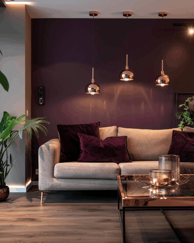 Wähle rauchiges Lila als Kontrast zu Kupfer. Die Mischung aus beiden Farben ist modern. Dunkle Violetttöne bringen Tiefe ins Zimmer. Kombiniere sie mit weißen oder grauen Elementen, um Ruhe zu schaffen.
