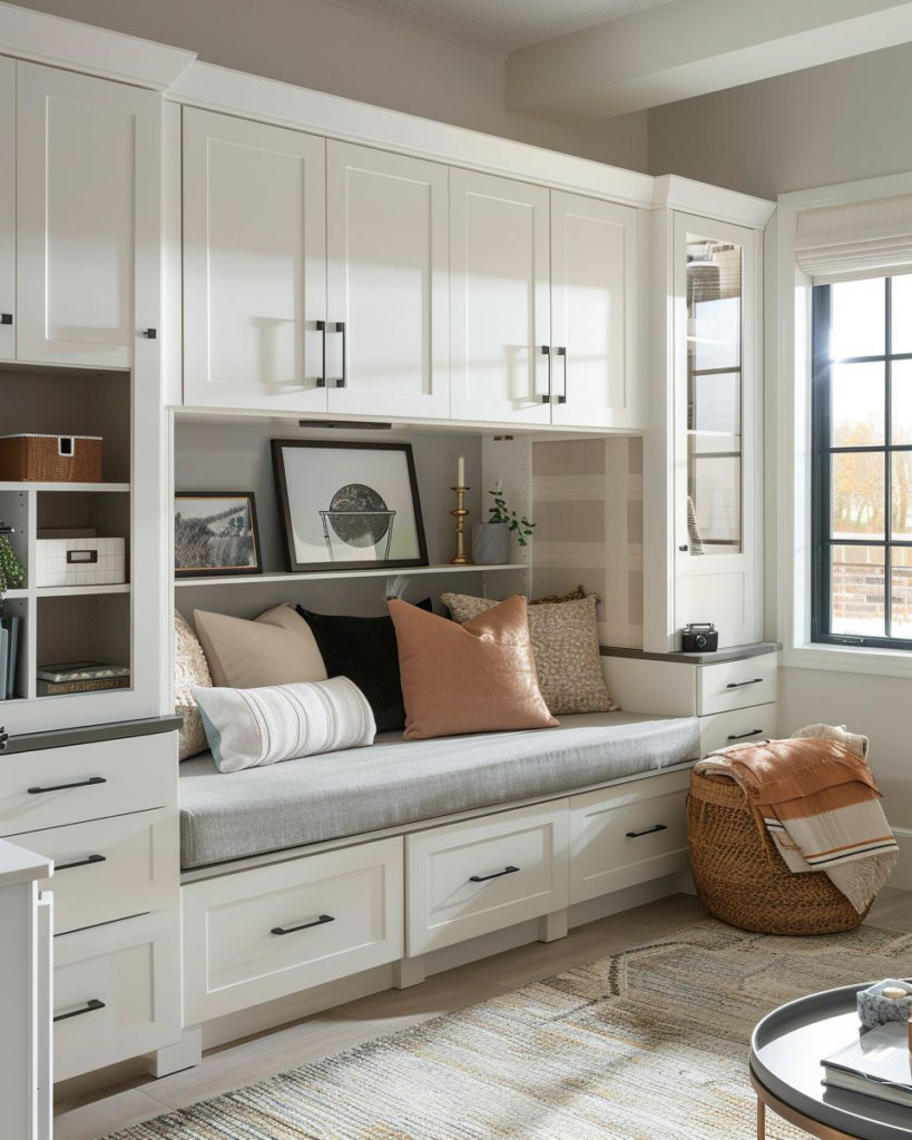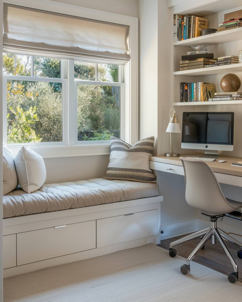 Gestalte die Fensterbank als Leseecke: Ein bequemes Kissen, eine tageslichtfreundliche Lampe und ein kleines Regal für Bücher machen die Fensterbank zum Rückzugsort. Nutze wenig Platz mit offenen Aufbewahrungsboxen unter der Sitzfläche. So schaffst du eine gemütliche Ecke, die Arbeit und Entspannung im Zimmer vereint.