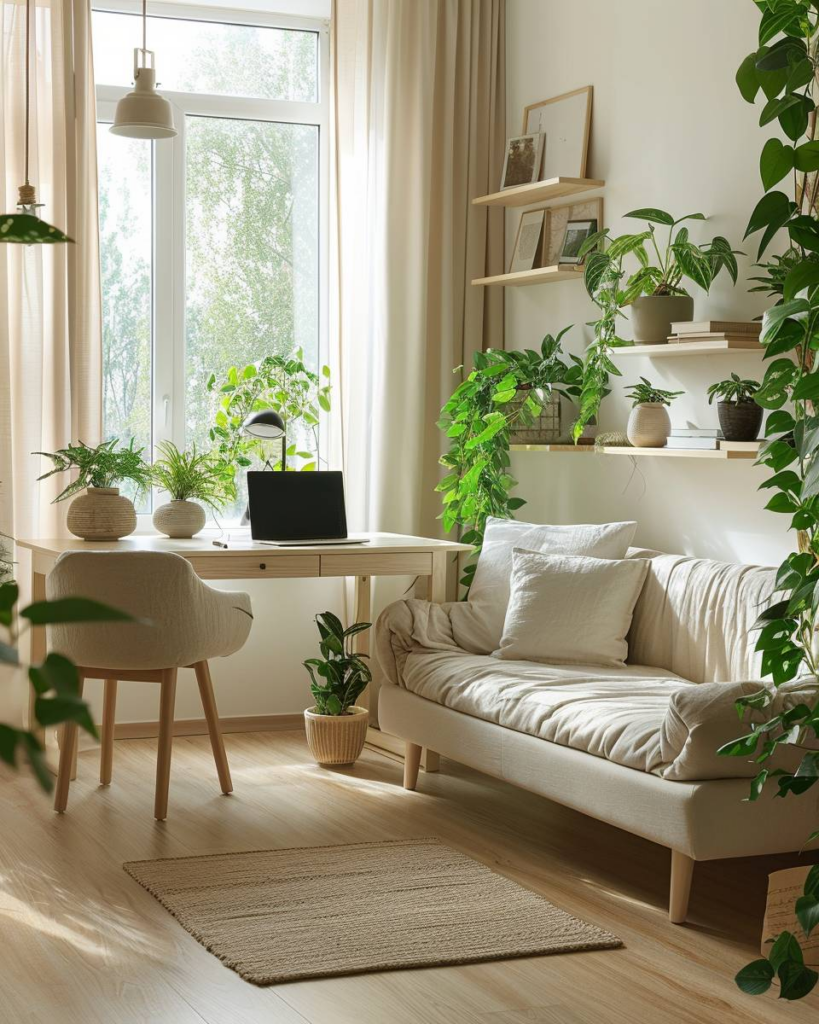 Setze Pflanzen auf deinen Schreibtisch, das Regal und die Fensterbank. Grünes macht die Luft frischer und bringt Ruhe in das Zimmer. Wir wählen robuste Pflanzen wie Sansevieria oder Einblatt, weil sie wenig Pflege brauchen. Starke Farben wie Grün oder sanfte Blätter steigern deine Konzentration und machen Gästezimmer und Arbeitsbereich freundlicher.