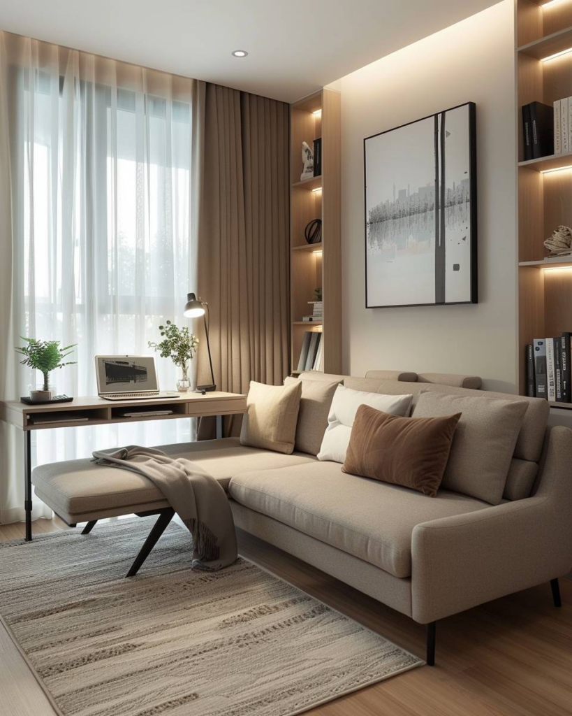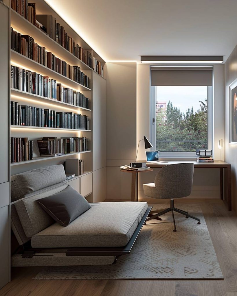 Wähle klappbare Schlafsofas, die wir schnell vom Arbeitsplatz zum Gästebett machen. Ein Schreibtisch mit Stauraum hält alles ordentlich. Ein Regal mit Fächern trennt Arbeits- und Ruhezonen. So nutzen wir jeden Quadratmeter sinnvoll.