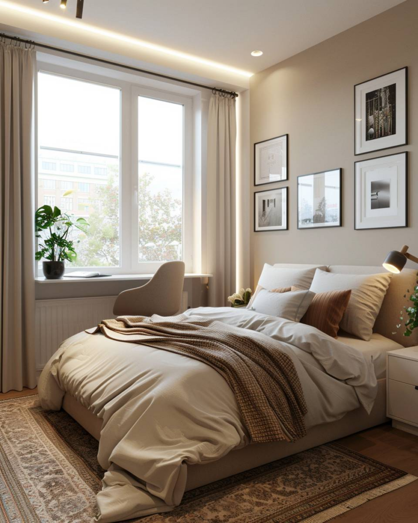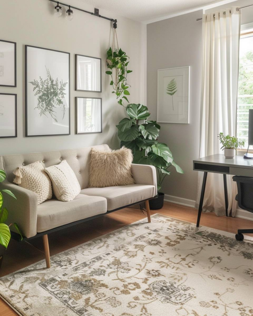 Lege einen weichen Teppich unter deinen Schreibtisch oder vor das Gästebett. Ein mittelgroßer Teppich ist ideal, weil er Wärme und Gemütlichkeit schafft. Wähle ein Modell in ruhigen Farben und mit pflegeleichtem Material. So verbinden wir Arbeitsbereich und Gästezone komfortabel.