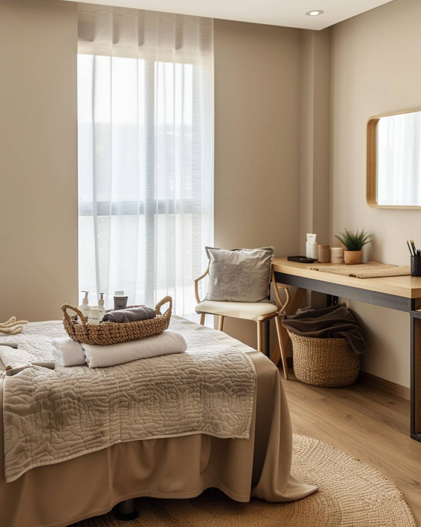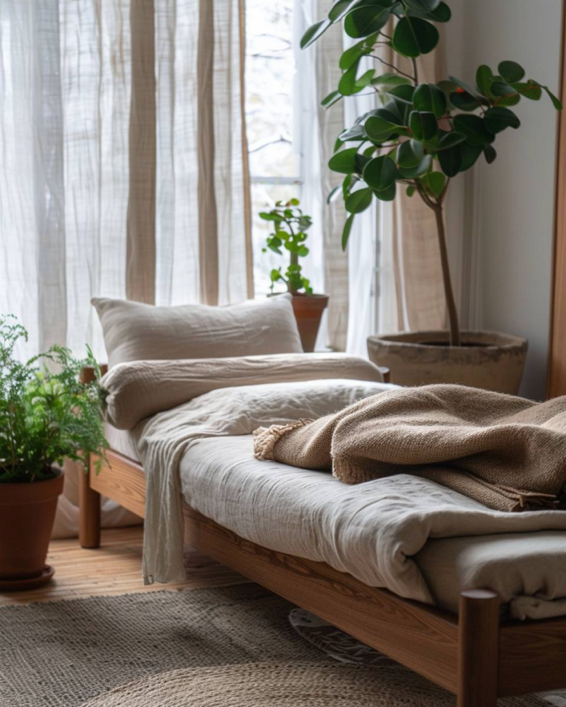Wähle Holz, Wolle und Leinen für Möbel, Vorhänge oder Kissen. Diese Materialien bringen Wärme und Ruhe in dein Zimmer. Wir setzen auf bequeme Sessel, Holztische und textile Teppiche. Mit Pflanzen schaffst du ein natürliches Raumklima.