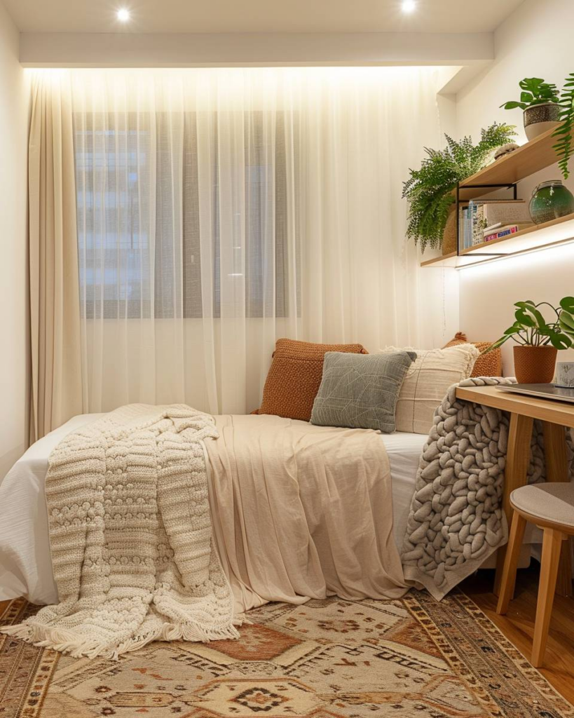 Setze auf verschiedene Stoffe für deinen Stuhl, das Bett und Kissen. Weiche Wolldecken sind kuschelig und wirken einladend. Glatte Baumwollkissen bieten Frische beim Arbeiten. Kombiniere Vorhänge aus Leinen für mehr Gemütlichkeit und eine ruhige Atmosphäre.