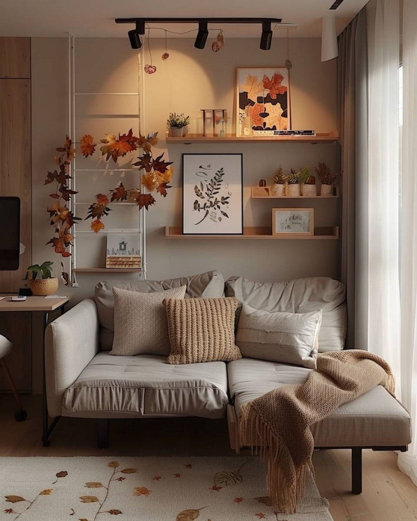 Bringe frische Stimmung mit saisonaler Dekoration in dein Zimmer. Wir setzen im Frühling auf bunte Blumen und im Herbst auf warme Farben. Im Winter wählen wir Lichterketten und Tannenzweige. Flexibilität schafft Gemütlichkeit und macht das Kombizimmer einladend für Gäste und Homeoffice.