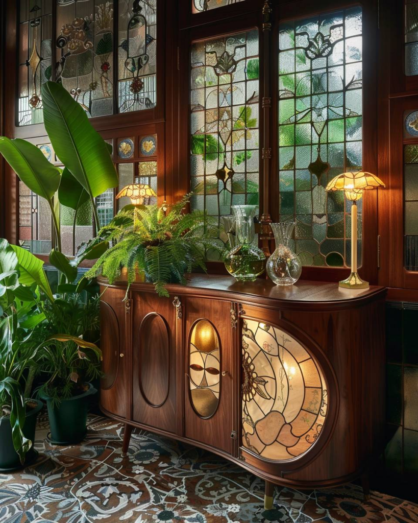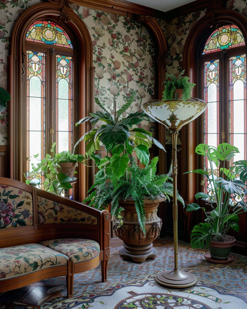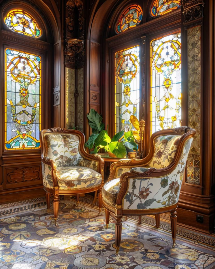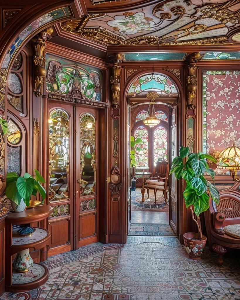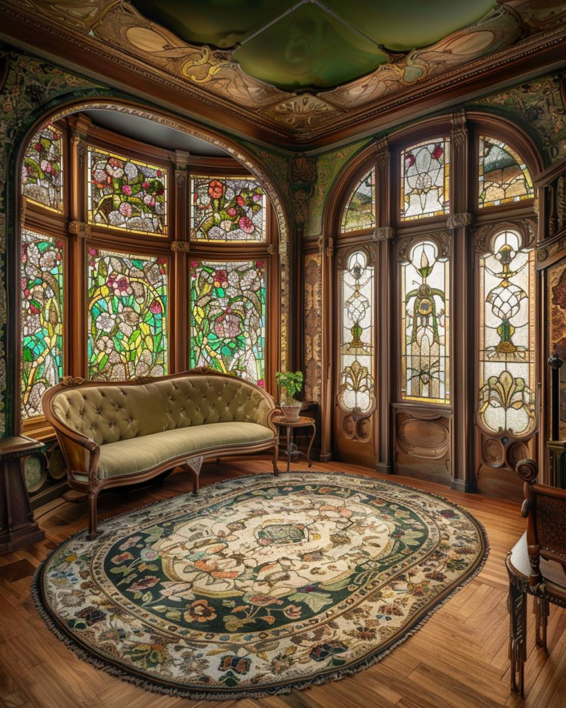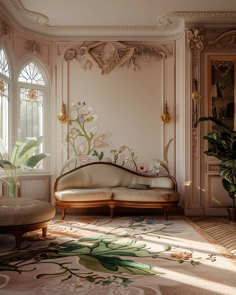 Du integrierst florale Muster in deine Tapeten, wählst Möbel mit geschwungenen Linien und betonst Fenster mit buntem Glas, um echte Art Nouveau-Atmosphäre zu schaffen.