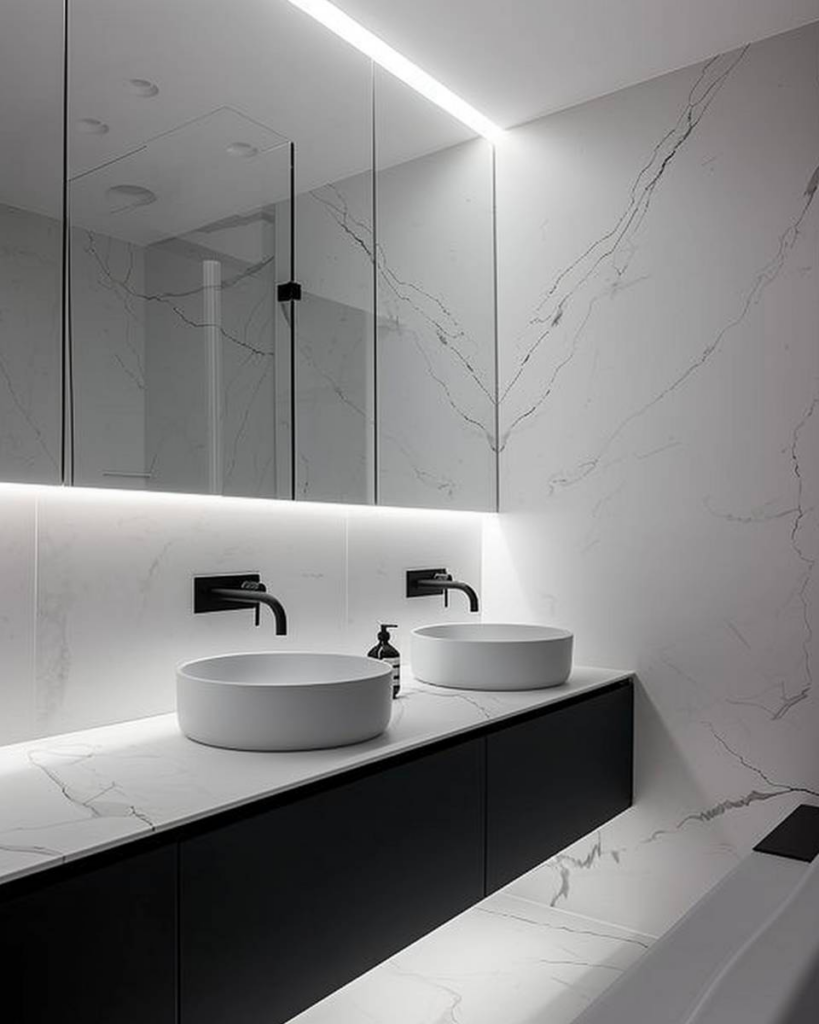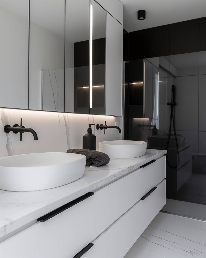 Wähle weiße Badmöbel mit schwarzen Griffen. Der Kontrast sieht modern aus. Weiße Oberflächen machen das Bad hell und wirken sauber. Die schwarzen Griffe setzen einen klaren Akzent und lassen sich leicht reinigen. Du schaffst mit dieser Kombination ein zeitloses und gepflegtes Badezimmer.