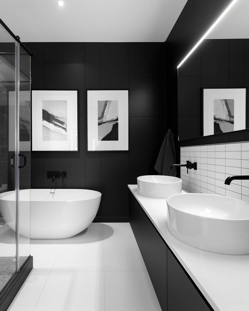 Bringe schwarz-weiße Kunstdrucke an. Sie bringen starke Kontraste an die Wand. Wähle klare Motive wie Grafiken oder Fotografien. Hänge die Bilder in schlichten Rahmen auf. Die Drucke machen dein Bad direkt modern und ruhig.