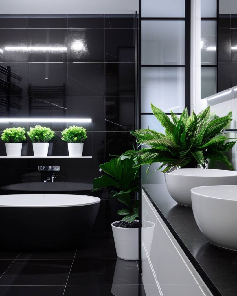 Setze schwarze Accessoires gezielt ein. Ein schwarzer Seifenspender oder Handtuchhalter ist ein klarer Akzent. Schwarze Armaturen oder ein Spiegelrahmen schaffen Ordnung. Zu viele schwarze Dekos wirken schwer. Halte das Gleichgewicht mit weißen Fliesen und heller Deko.