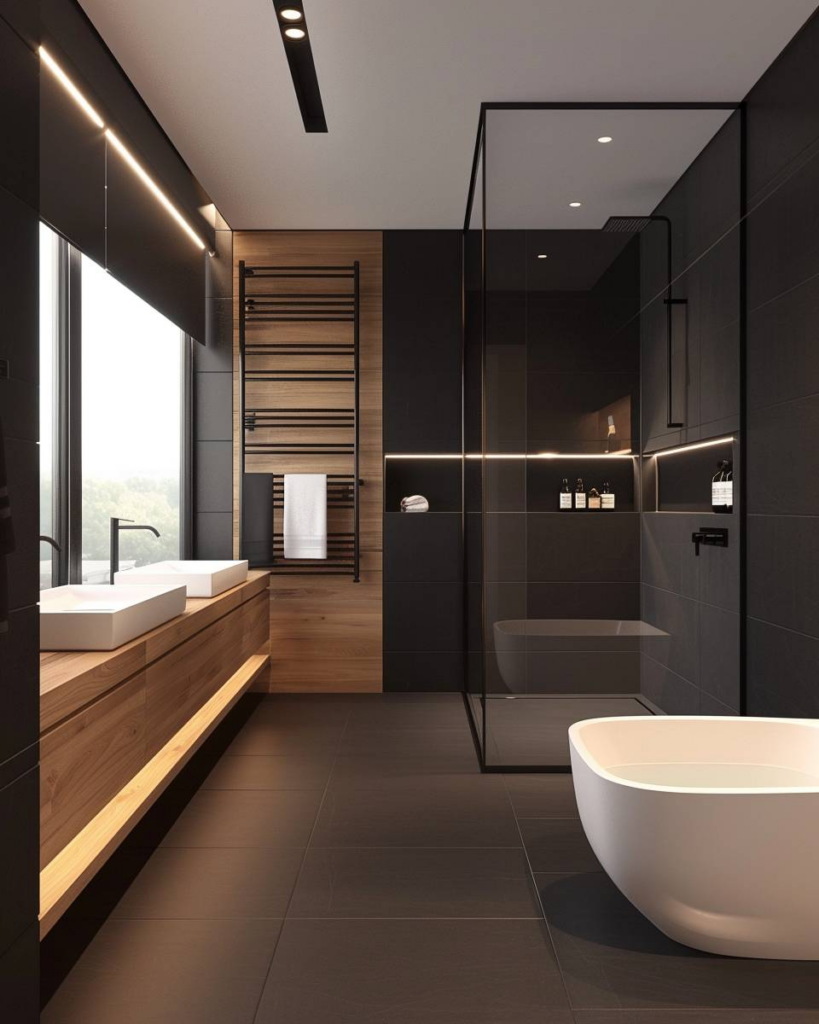 Setze auf Holz-Elemente wie Regale, Hocker oder Ablagen. Holz schafft sofort Wärme zwischen schwarzen Fliesen und weißen Wänden. Helles Eichenholz wirkt ruhig und frisch. Dunkles Holz bringt Tiefe und Kontrast.