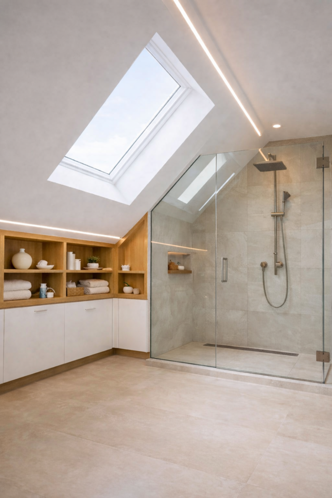 Bau eine ebenerdige Dusche unter die Dachschräge. Wir nutzen eine gläserne Duschwand, damit das Licht den Raum hell macht. Der wasserdichte Boden ist wichtig, damit kein Wasser unter die Fliesen kommt. Ein wandnaher Ablauf lässt das Wasser schnell abfließen und spart Platz.