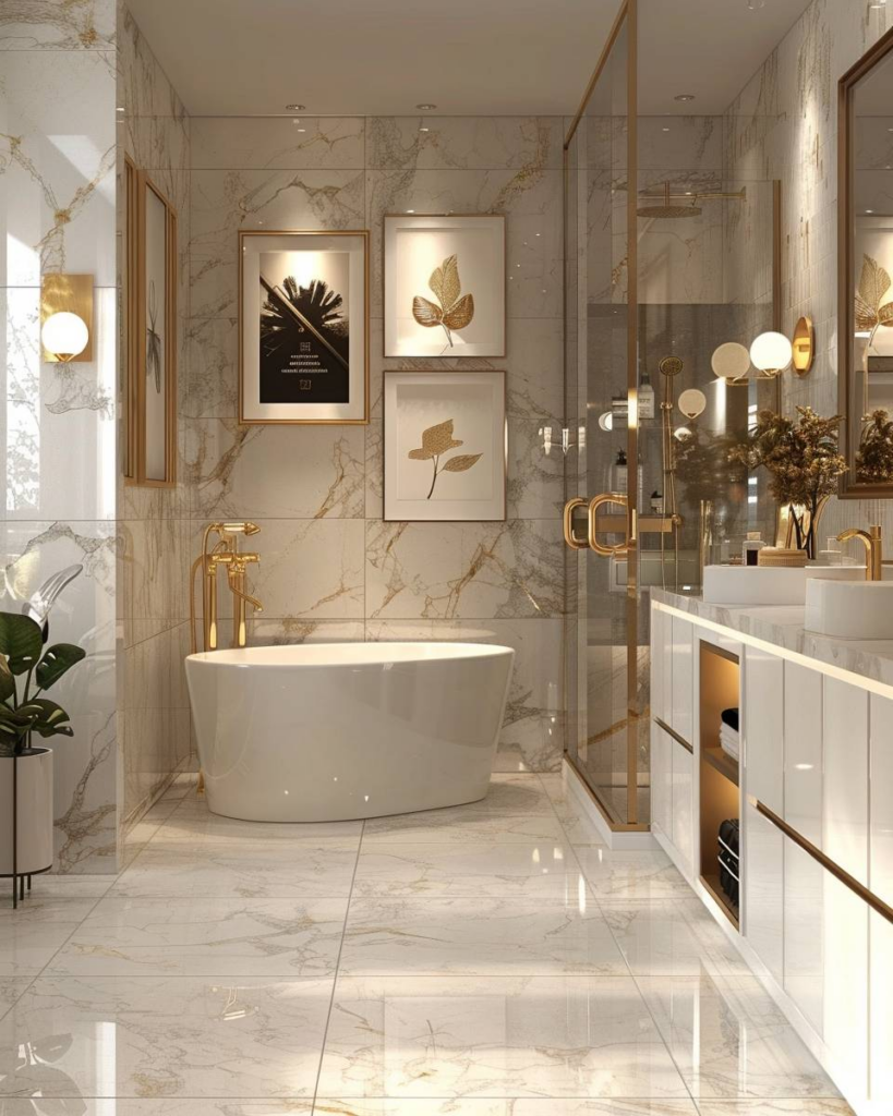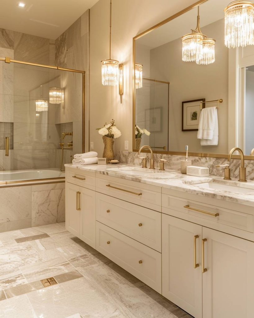 Setze auf goldene Lampen für dein Bad. Goldene Leuchten machen das Licht weich und schaffen sofort eine behagliche Atmosphäre. Kombiniere sie mit weißen Fliesen und klaren Spiegeln, damit Gold richtig strahlt. Achte auf schlichte Formen, damit das Bad modern bleibt.