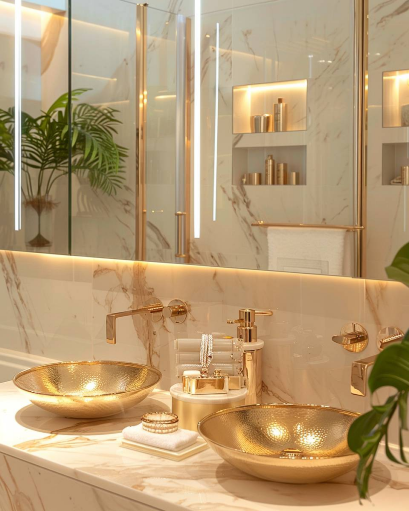 Lege goldene Tabletts auf die Ablage. Pflegeprodukte sortieren wir darauf nach Größe und Nutzen. Klare Gruppen geben dem Badezimmer Ruhe. Glasbehälter oder Pumpspender sehen auf Gold modern aus. Frische Blumen in kleine Vasen bringen Leben dazu.