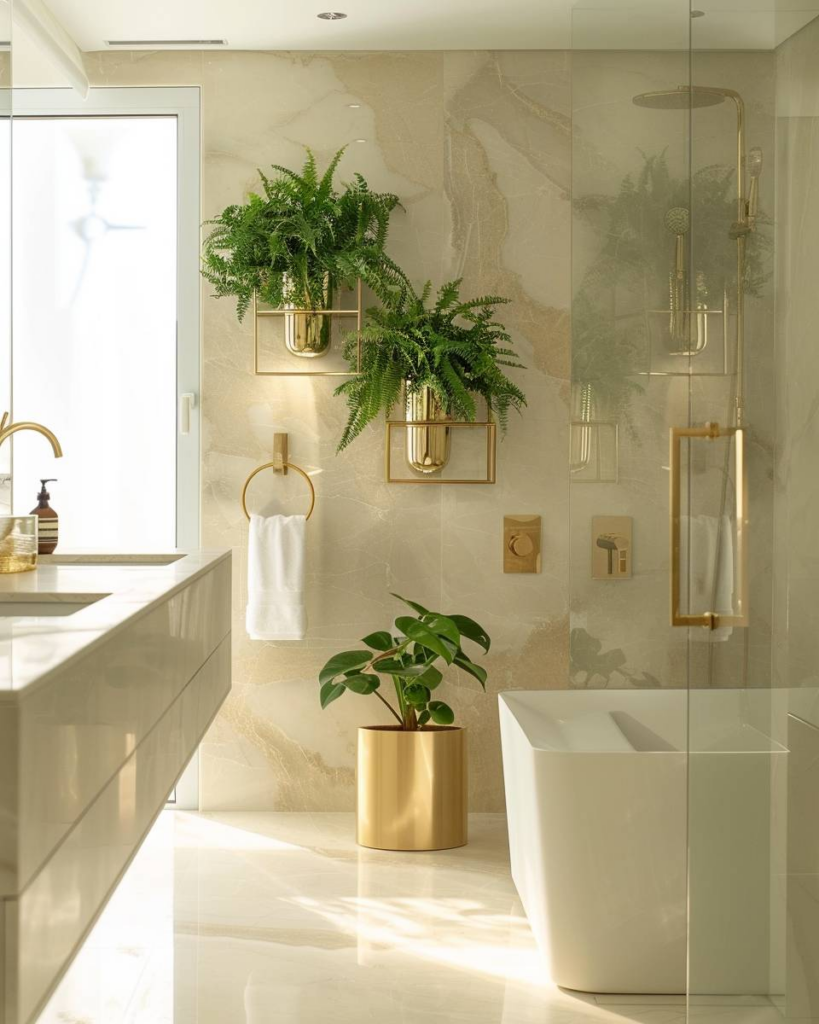 Bringe goldene Pflanzenhalter an die Wand, um dein Badezimmer mit frischer Luft und grüner Farbe zu füllen. Goldene Halter setzen Akzente und bringen die Blätter von Farn, Efeu oder Sukkulenten gut zur Geltung. Kombiniere die Halter mit hellen Fliesen und klaren Linien. Damit bleibt das Badezimmer modern und pflegeleicht.