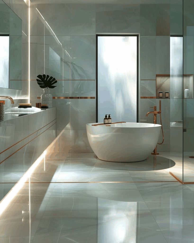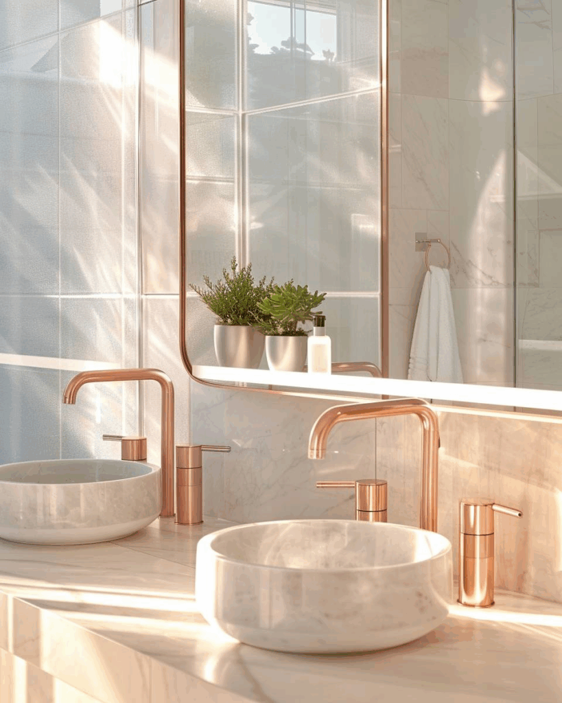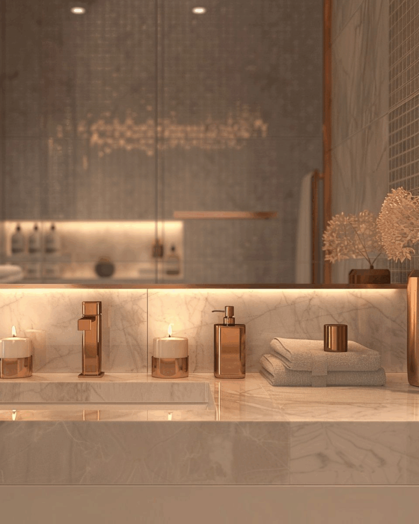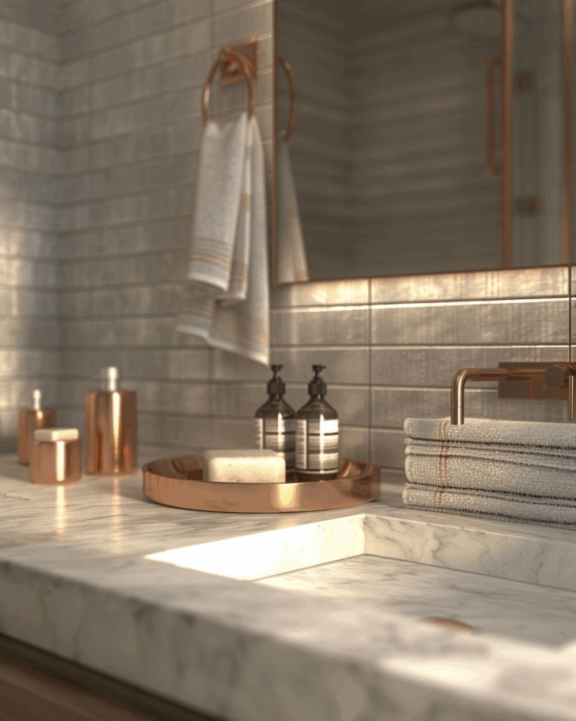 Setze auf Kupfer und Marmor für echtes Luxus-Feeling. Kupfer-Armaturen glänzen neben einer Marmor-Waschtischplatte und bringen Stil ins Bad. Kombiniere glatte Marmorfliesen mit Kupfer-Accessoires wie Spiegelrahmen oder Seifenspender für einen exklusiven Look.
