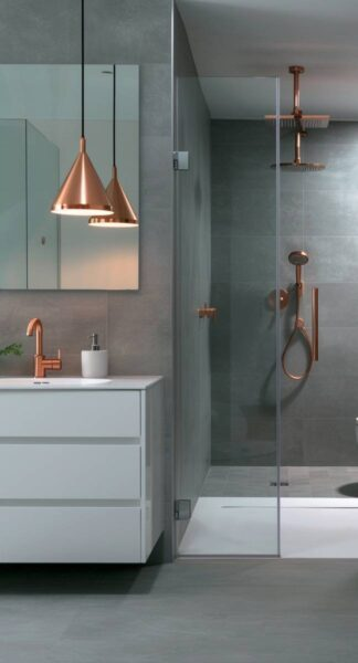 Mit kupfernen Armaturen, eleganten Kupferregalen und auffälligen Kupferleuchten richtest du dein Badezimmer stilvoll ein und schaffst sofort einen besonderen Look.