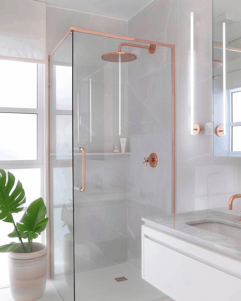 Setze kupferfarbene Duschköpfe für modernen Look. Kupfer wirkt edel und bringt Wärme ins Bad. Die Oberfläche passt zu Marmor, Beton oder weißen Fliesen. Kombiniere dazu schlichte Armaturen und helle Wandfarben. So entsteht ein frisches, modernes Bad.