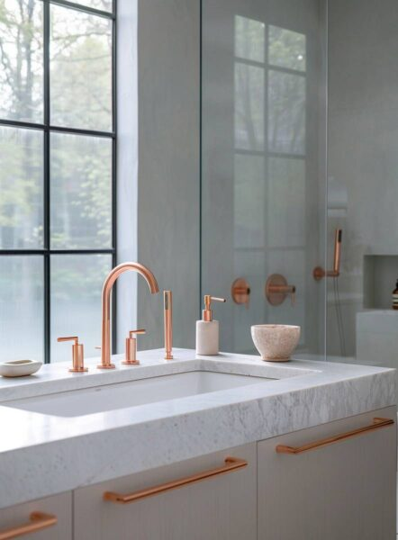 Wähle kupferne Armaturen als starken Akzent. Waschtisch, Dusche und Badewanne wirken sofort viel moderner. Der warme Ton passt zu Keramik, Glas und Stein. Pflege kupferne Oberflächen regelmäßig, damit sie lange schön bleiben.