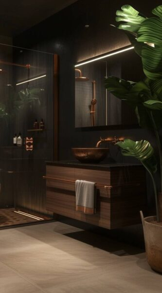 Dunkle Wände wirken mit Kupferakzenten edel und lebendig. Wir setzen glänzende Armaturen, Spiegelrahmen oder Lampen aus Kupfer ein. So bringst du Wärme und Kontrast in dein Badezimmer. Kupfer ist leicht zu pflegen und bleibt lange schön.