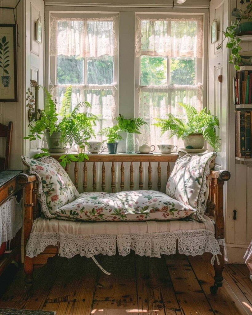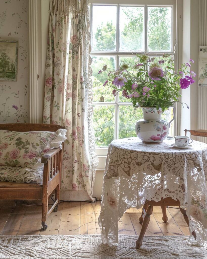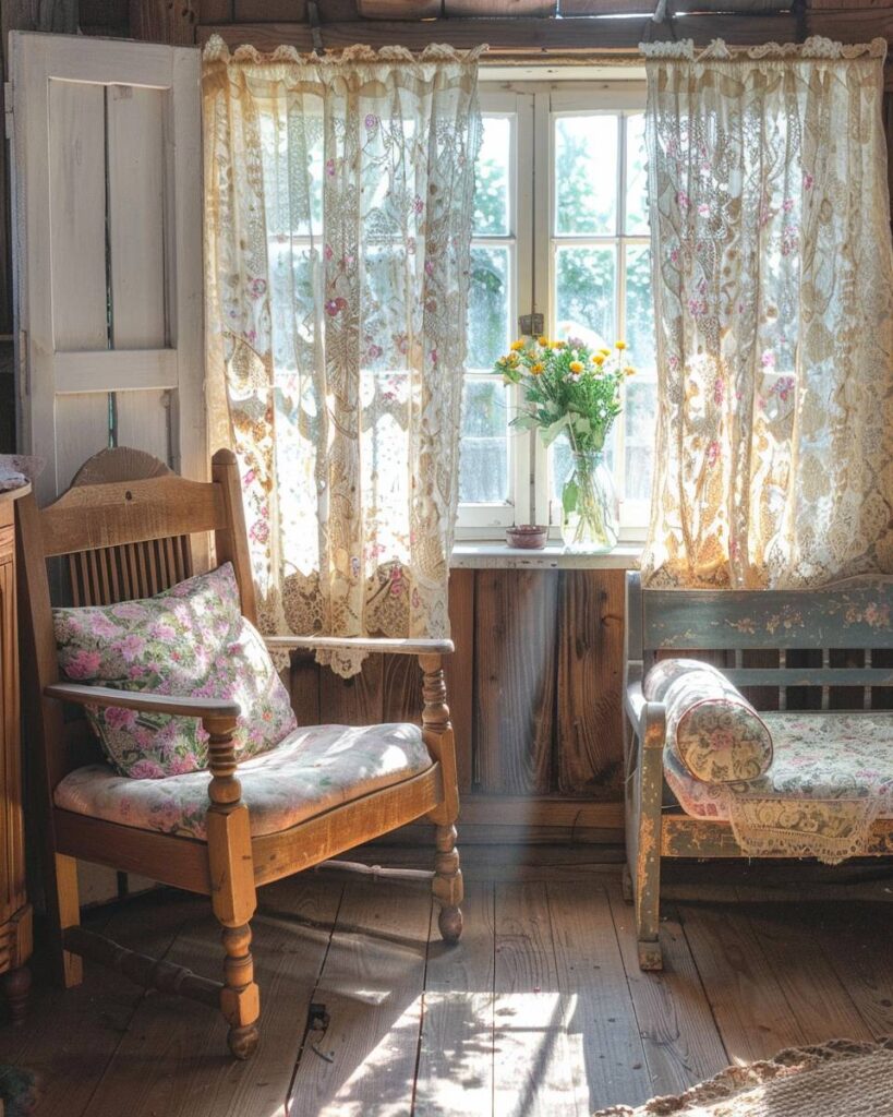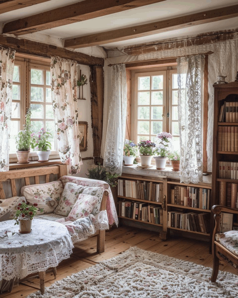 Hänge zarte, halbtransparente Vorhänge aus Leinen oder Baumwolle auf. Sie filtern das Licht weich und schaffen eine warme, ruhige Atmosphäre. Florale Muster oder leichte Karos passen perfekt zum Cottagecore-Stil. Nutze Gardinenstangen aus Holz oder Schmiedeeisen. Achte darauf, dass die Länge der Vorhänge bis zum Boden reicht.