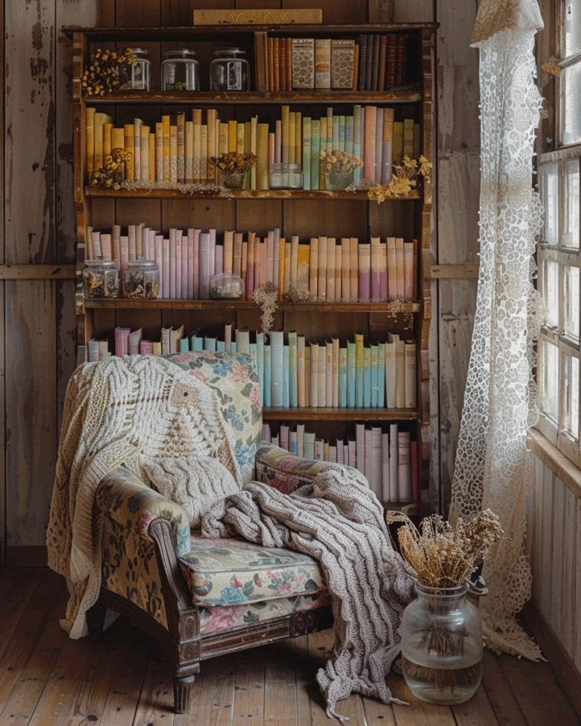 Sortiere deine Bücher nach Farben und Themen, um Regalflächen ruhig und harmonisch wirken zu lassen. Gruppiere Romane, Sachbücher und Bildbände in Farbblöcken. So entsteht ein einheitlicher Look, der perfekt zum Cottagecore-Stil passt. Bücher mit floralen Covern oder alten Einbänden setzen zusätzlich visuelle Akzente.
