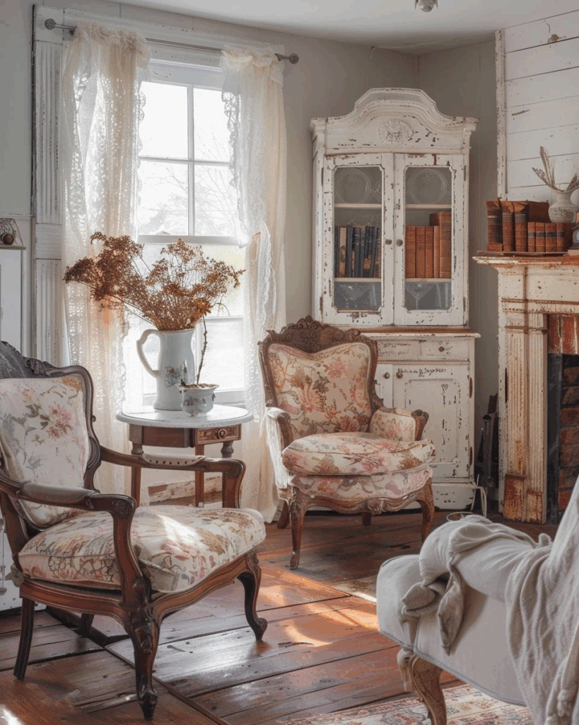 Stell alte Möbel ins Zentrum deiner Einrichtung. Vitrinen, Kommoden und Holzstühle mit Gebrauchsspuren bringen echtes Landhausgefühl in dein Zuhause. Achte auf natürliche Materialien wie massives Eichenholz oder gedrechselte Beine. Kombiniere sie mit Leinenstoffen und Keramik, um den Cottagecore-Stil zu vollenden.