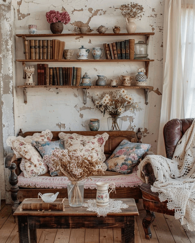 Stöbere nach alten Schätzen mit Geschichte. Keramik mit Rissen, Holzmöbel mit Patina oder Spiegel mit abgeblättertem Rahmen bringen sofort Tiefe in dein Zuhause. Diese Teile sind nie perfekt, aber genau das macht ihren Charme aus. Kombiniere sie mit weichen Stoffen und Naturmaterialien, um den Cottagecore-Look warm und echt wirken zu lassen.