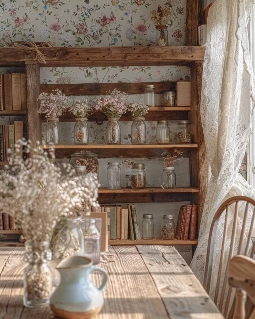 Stelle Regale mit getrockneten Wildblumen zusammen, um mehr Natürlichkeit in dein Zuhause zu bringen. Nutze Glasvasen, alte Flaschen oder Steingutgefäße. Achte auf unterschiedliche Höhen und ordne die Blumen locker an. Kombiniere Gräser, Mohnkapseln oder Kamille. So wirkt dein Regal ruhig, warm und ländlich.