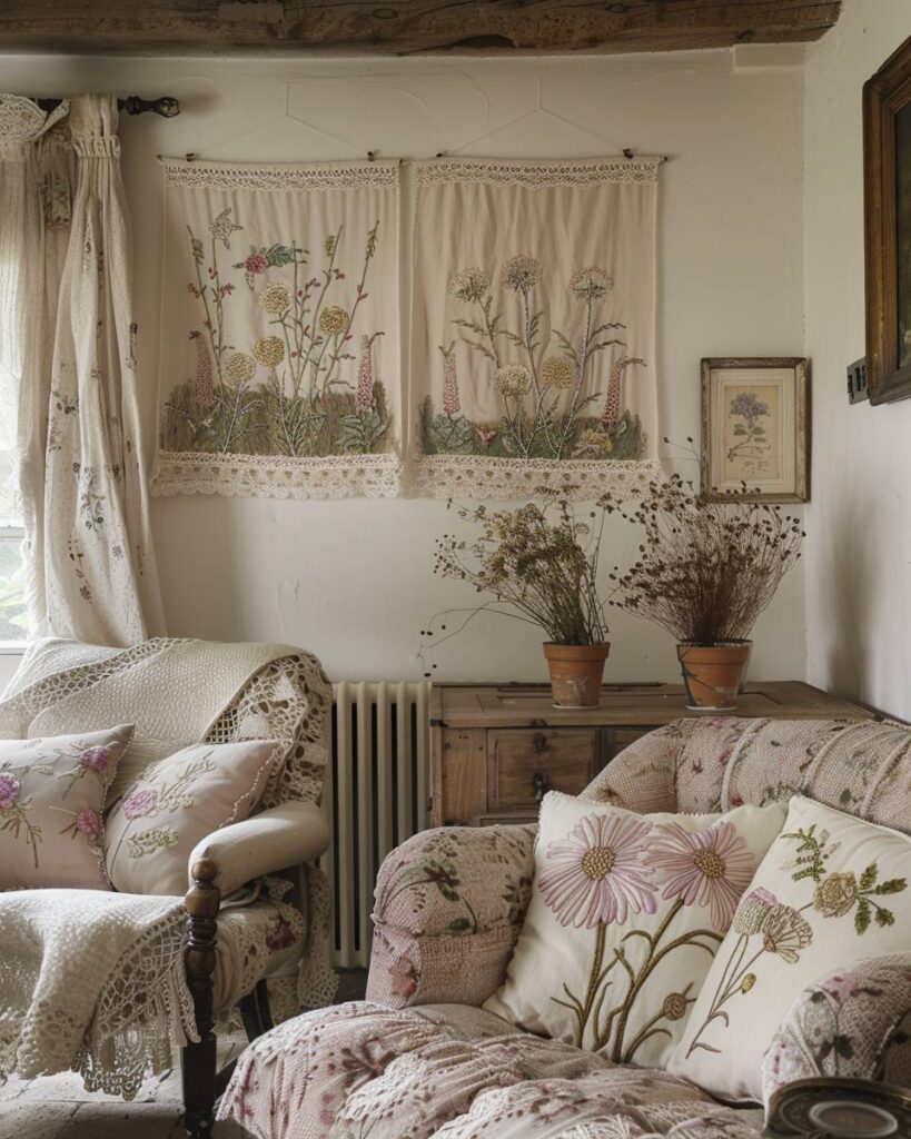Bring bestickte Bilder im Landhausstil an die Wand, um Texturen und Handarbeit sichtbar zu machen. Wähle Rahmen aus holzfarbenem Naturmaterial, die zur restlichen Einrichtung passen. Gut wirken sie über dem Sofa, im Flur oder über der Kommode. Achte auf ruhige Pastellfarben und florale Motive, damit sie sich harmonisch einfügen.