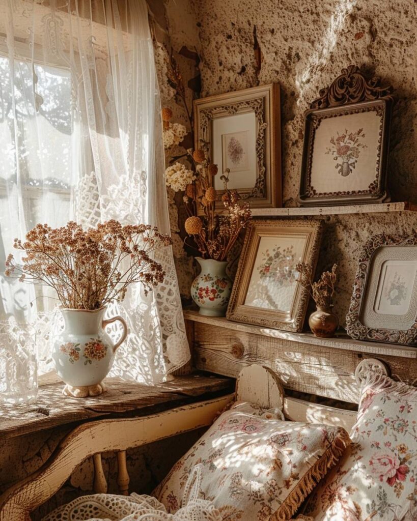 Gestalte kleine Blickfänge mit alten Bilderrahmen, indem du sie mit getrockneten Blumen, bestickten Stoffen oder Vintage-Postkarten füllst. Platziere sie auf einer Kommode aus Holz oder in einem offenen Regal. Kombiniere verschiedene Größen, um Tiefe zu schaffen. Pastelltöne und Patina bringen den typischen Cottagecore-Charme. Nutze Rahmen mit abgeblättertem Lack für einen echten Landhauslook.
