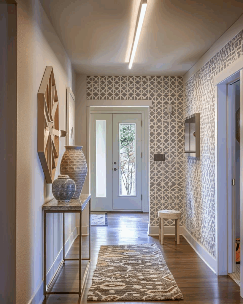 Lege eine gemusterte Läufermatte in deinen Flur. Sie schützt den Boden und bringt direkt mehr Farbe in den Raum. Ein auffälliges Muster setzt einen starken Akzent und versteckt Schmutz besser. So wirkt dein Flur sofort einladender und lebendiger.
