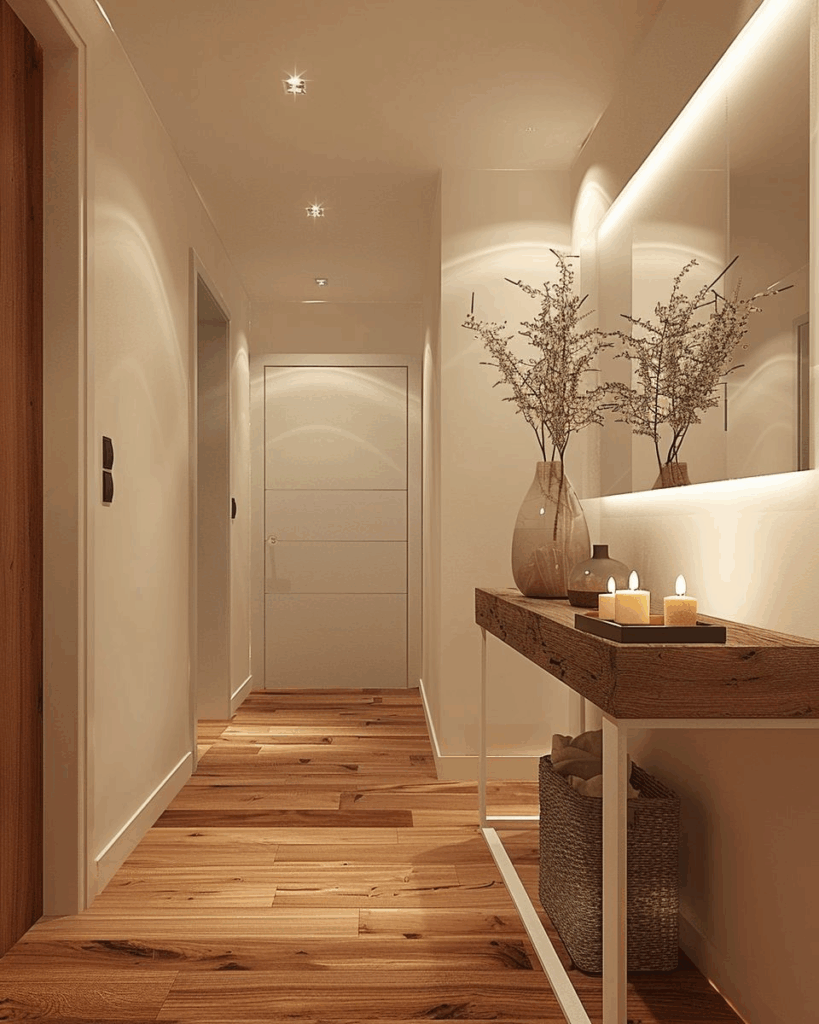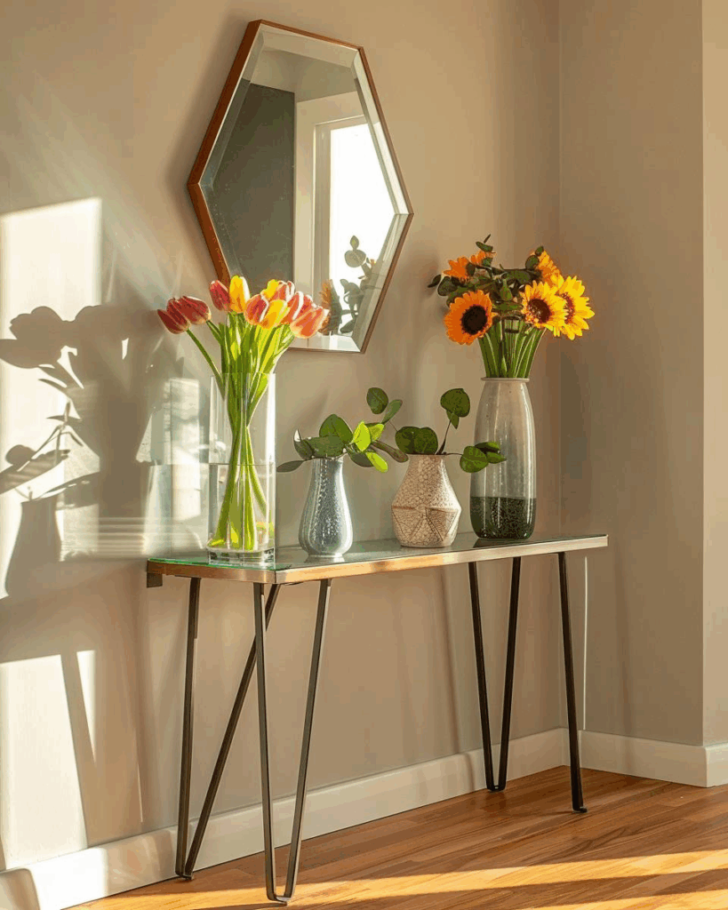 Stelle eine schmale Konsole an deine Wand. Du sparst Platz und hast Fläche für Deko wie Vase, Tablett oder Schlüsselablage. Arrangiere einen Spiegel darüber. Mit einem schlichten Bild oder einer kleinen Lampe entsteht direkt ein ordentlicher und wohnlicher Eindruck im Flur.