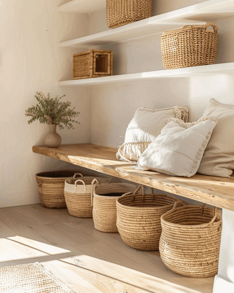 Verwende Körbe für clevere Aufbewahrung. Körbe aus Seegras oder Metall nehmen Schals, Mützen oder Schlüssel auf. Wir ordnen sie auf der Garderobe oder stellen sie unters Sitzmöbel. So bleibt dein Flur aufgeräumt und wirkt wohnlich.