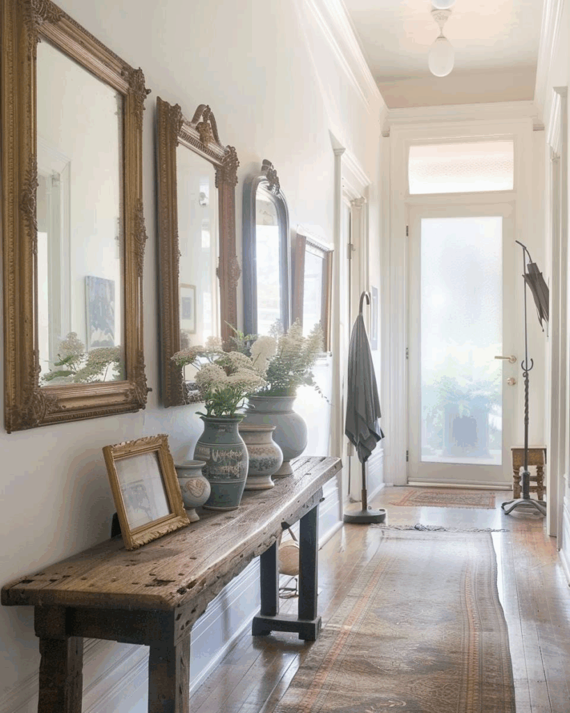 Wähle einen großen Statement-Spiegel für den Flur. Ein Spiegel öffnet den Raum und bringt Helligkeit. Wir platzieren den Spiegel am besten gegenüber der Tür, damit er das Licht reflektiert. Mit einem besonderen Rahmen setzen wir einen starken Akzent, der sofort auffällt.