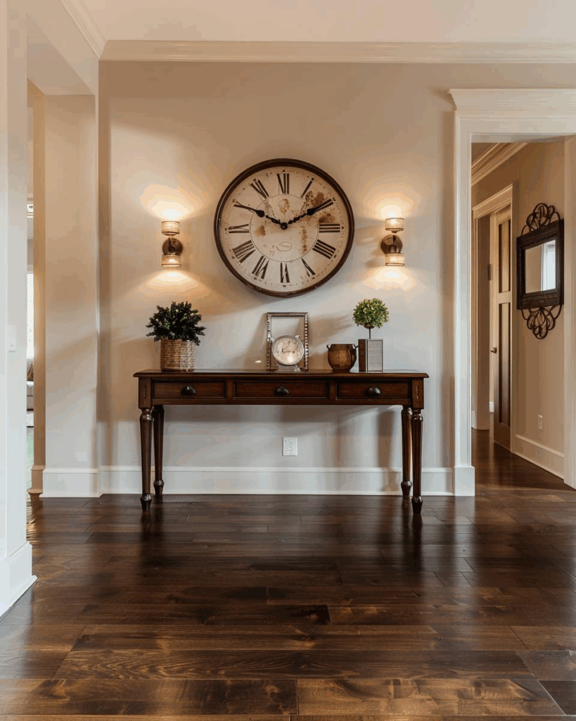 Bringe eine schöne Wanduhr gut sichtbar über einer Kommode oder Bank an. Die Uhr ist ein echter Blickfang und hilft dir, die Zeit im Griff zu behalten. Wähle ein schlichtes Modell, damit es zu deinem Einrichtungsstil passt. Mit einer auffälligen Wanduhr schaffst du Gemütlichkeit und Struktur im Flur.