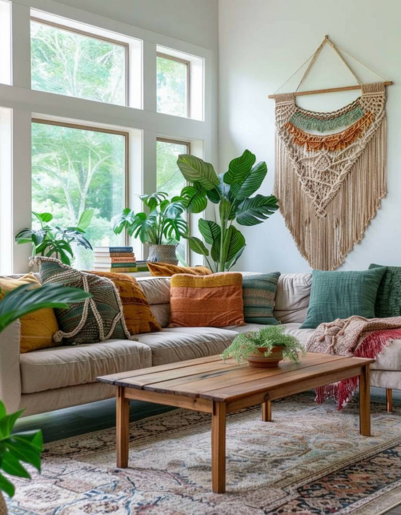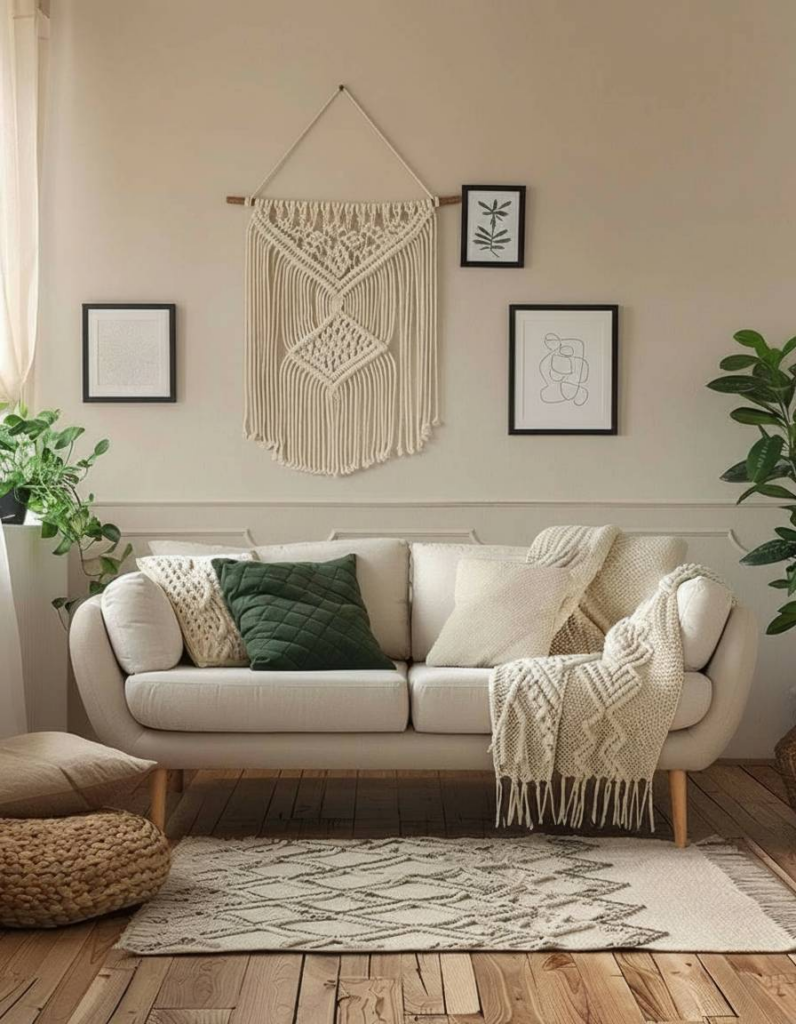 Bringe einen Makramee-Wandbehang direkt über dein Sofa an. Der Behang ist ein starker Blickfang. Wir wählen Muster, die zur Sofafarbe und zur Wand passen. So entsteht ein gemütlicher und wohnlicher Raum.