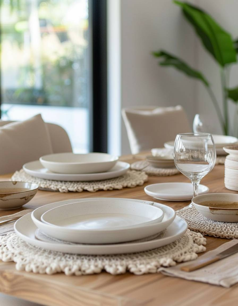 Positioniere Makramee-Untersetzer auf deinem Esstisch