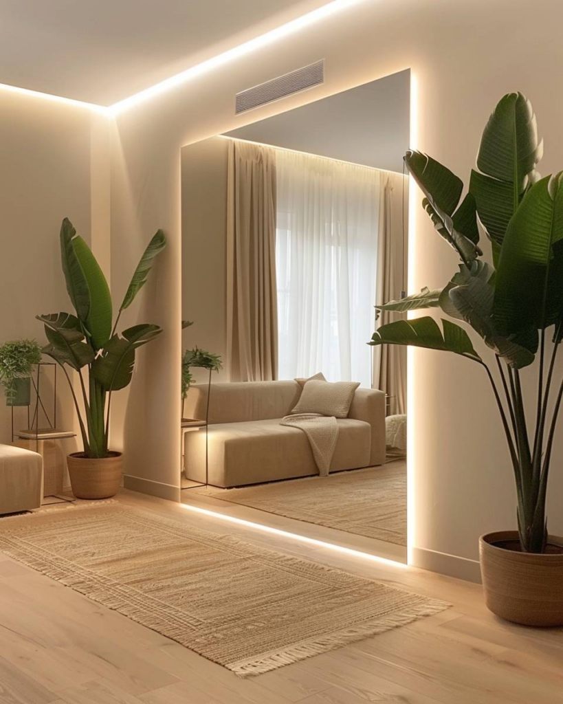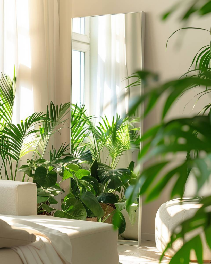 Stell Spiegel hinter deine Pflanzen. Die Spiegel reflektieren das Licht. Das Bild der Pflanzen wirkt dadurch größer. Dein Raum bekommt so mehr Tiefe und sieht lebendiger aus.