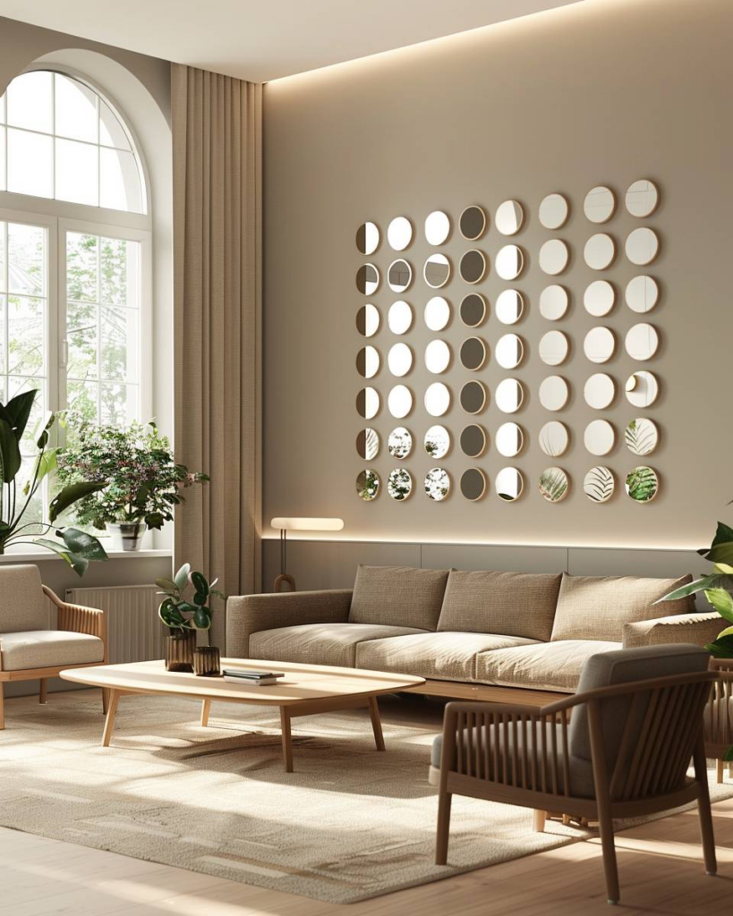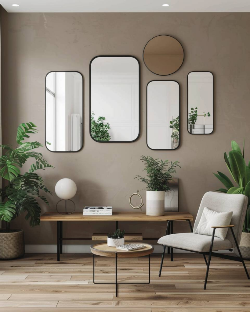 Nutze verschiedene Spiegelarten für deine Wand. Runde, eckige und ovale Spiegel bringen Abwechslung rein. Setze verschieden große Spiegel zusammen, um Tiefe und Dynamik zu schaffen. Platziere die Spiegel in Gruppen, damit die Wand spannend wirkt. Halte genug Abstand, damit jede Form zur Geltung kommt.
