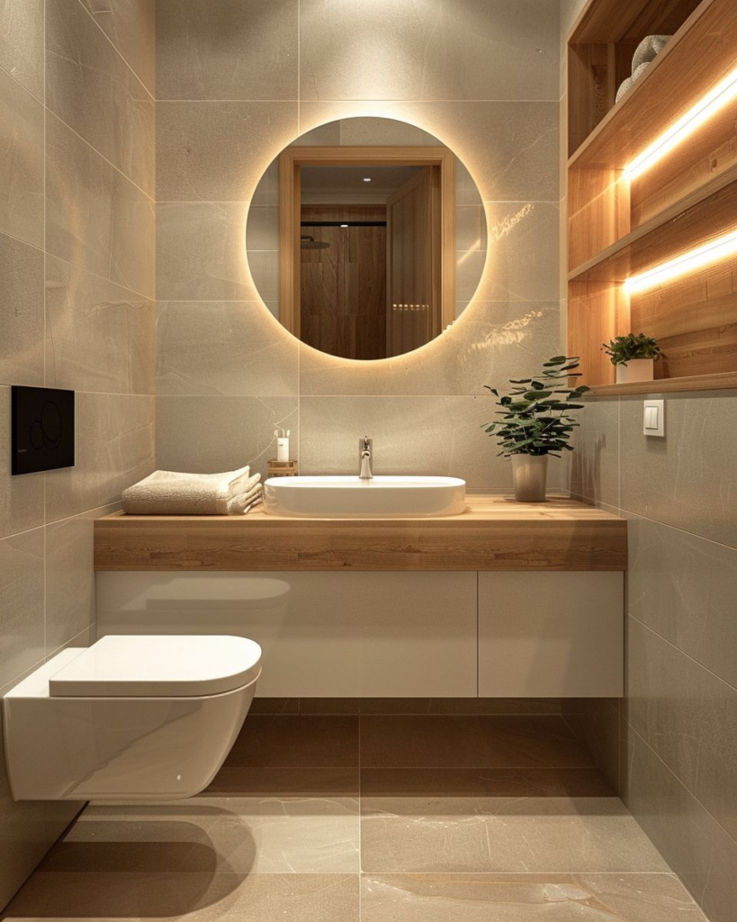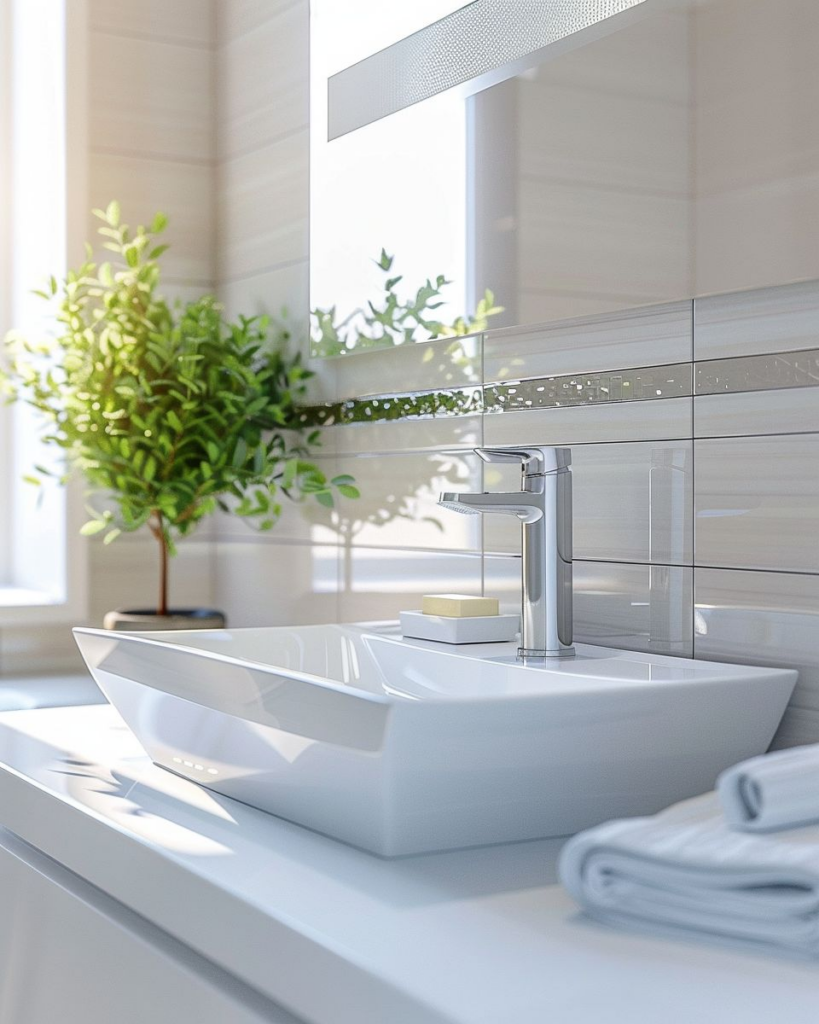 Verwende Spiegelfliesen, um dein Badezimmer größer wirken zu lassen. Wir platzieren sie gezielt hinter dem Waschbecken oder in der Dusche. Die Fliesen reflektieren Licht und bringen mehr Helligkeit in den Raum. Passe die Größe und Anordnung den vorhandenen Fliesen an. Damit schaffst du eine klare, elegante Optik.