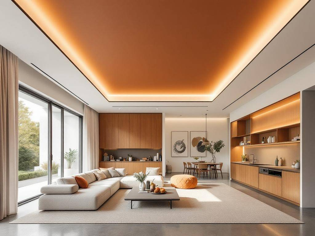 Mach die Decke zur fünften Gestaltungsfläche. Farbe in satten Tönen ist dein schnellster Hebel für Raumtiefe. Tapete mit feiner Struktur ist Blickfang und versteckt Unebenheiten. Akustikpaneele aus Holz sind warm und mindern Nachhall. Plane LED-Profile und Pendelleuchten als Lichtzonen, die Wege führen und Zonen bilden.