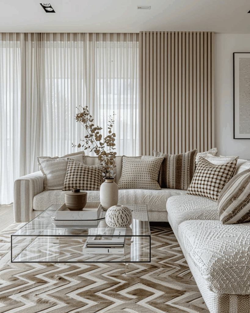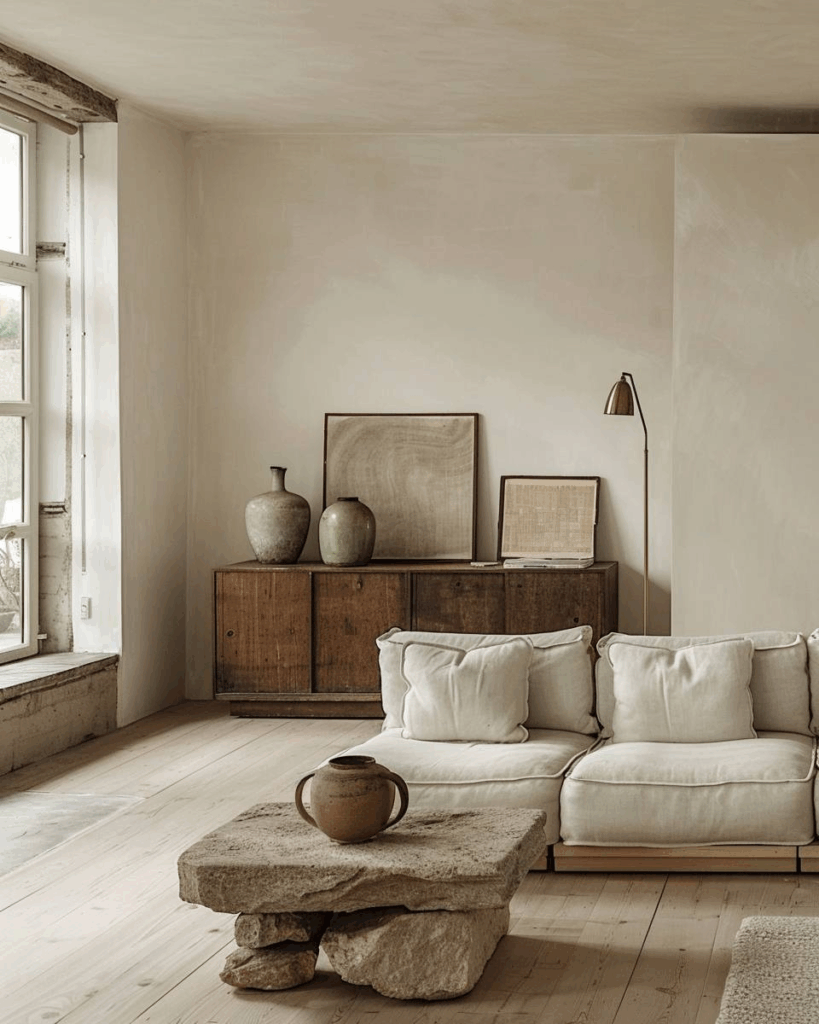 Setze auf sanfte Naturtöne für ruhige Räume. Die Basis ist Beige, Sand und Salbeigrün mit viel Weiß. Materialmix ist Holz, Leinen, Jute und Wolle mit matten Oberflächen. Plane Ton-in-Ton und setze warmes Licht statt bunter Deko.