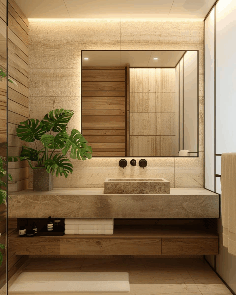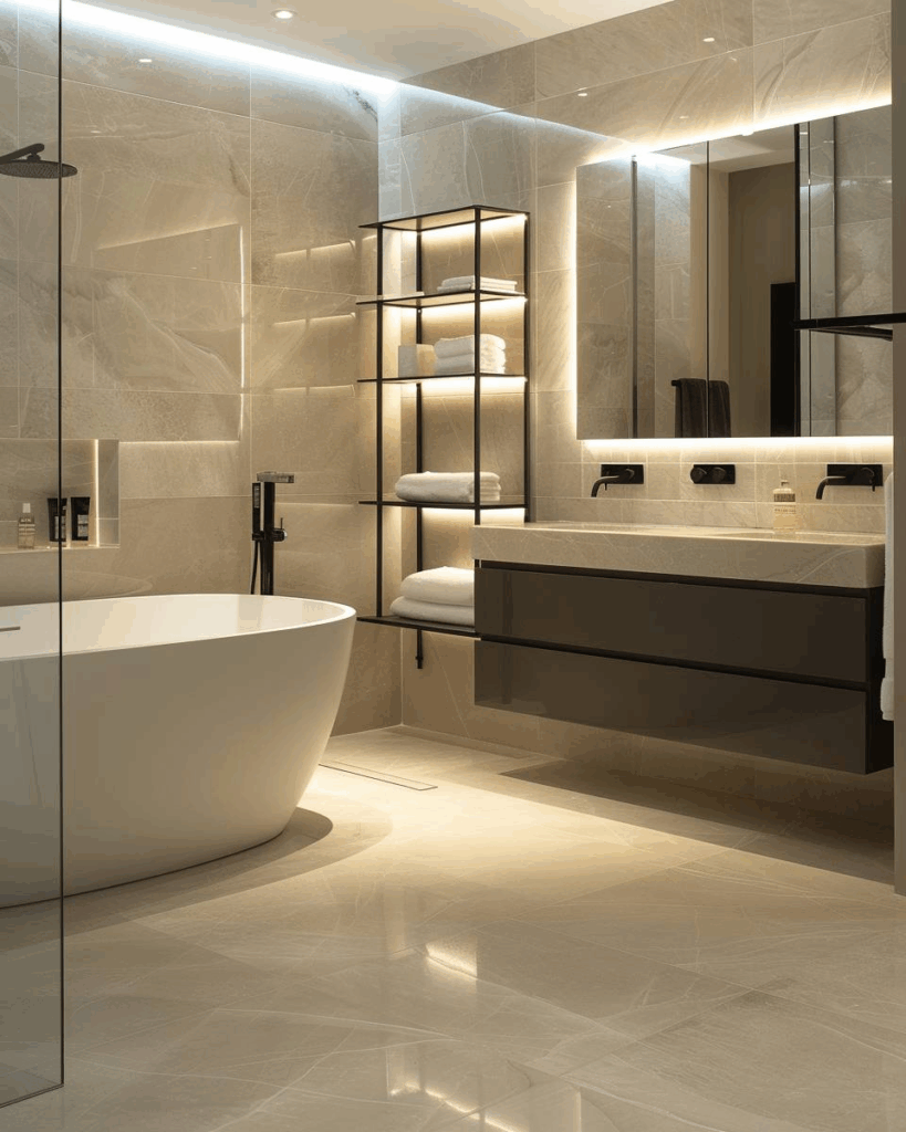 Wähle praktische Möbel, die trotzdem gut aussehen. Waschtischunterschränke mit grifflosen Fronten wirken clean und bieten viel Stauraum. Spiegelschränke mit Beleuchtung helfen beim Schminken und lassen das Bad größer wirken. Offene Regale aus Holz bringen Wärme in den Raum und halten Handtücher griffbereit. Achte auf ruhige Farben und klare Linien, damit dein Bad modern bleibt.
