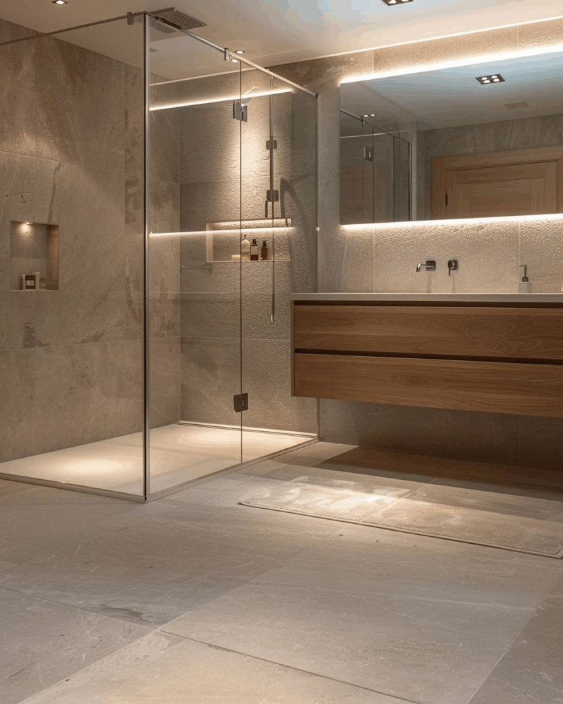 Setze auf klare Glasflächen, um dein Bad größer wirken zu lassen. Eine bodengleiche Dusche mit Glaswand öffnet den Raum und lässt mehr Licht durch. Auch große Spiegel strecken optisch und machen kleine Bäder luftiger. Verzichte auf sichtbare Rahmen oder milchiges Glas. Klare Linien bringen Ruhe und Struktur.