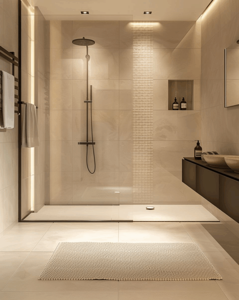 Schaffe Stille mit Farben, die gut zusammenpassen. Warme Erdtöne, sanftes Grau oder gedecktes Blau wirken beruhigend. Großflächige Fliesen in diesen Tönen geben deinem Bad eine klare Linie. Kombiniere sie mit matten Oberflächen und wenig Kontrast für mehr Gelassenheit. So wird dein Badezimmer ein Ort zum Abschalten.