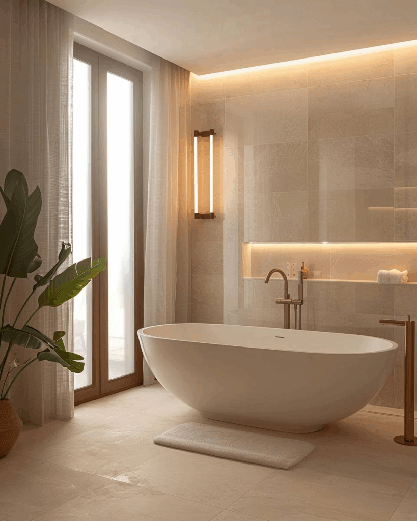 Du gestaltest dein Bad mit einer freistehenden Designer-Badewanne als Blickfang, setzt mit indirekter Beleuchtung stimmungsvolle Akzente und bringst warme Holzakzente für Natürlichkeit ein.