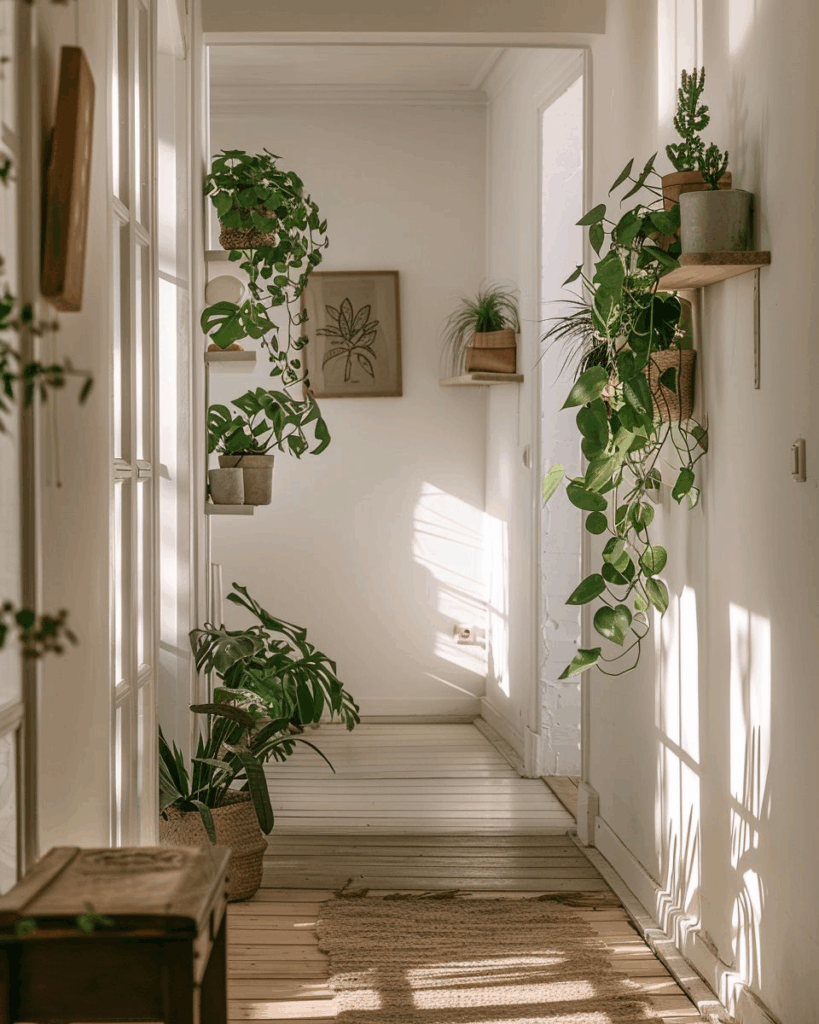 Stelle Pflanzen für frische Atmosphäre im Flur zusammen. Nutze große Grünpflanzen wie Monstera oder Ficus in schlichten Töpfen neben der Garderobe. Hänge kleine Sukkulenten oder Farne in Wandhalterungen auf Augenhöhe. Stelle einheitliche Übertöpfe auf eine schmale Konsole. Achte auf ausgewogene Größen und Gruppen mit unterschiedlichen Blattformen.