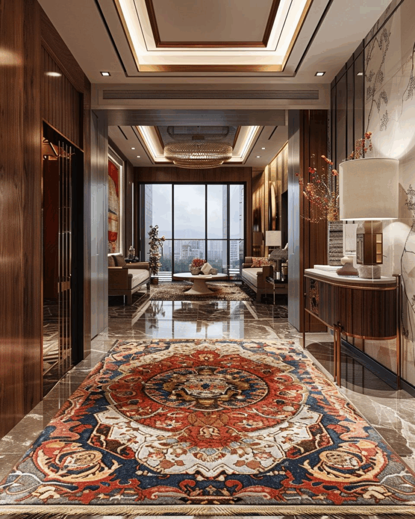 Setze klare Linien mit einem großen, hochwertigen Teppich im Flur. Er definiert den Übergang von Eingang zu Wohnbereich und schafft visuelle Ordnung. Wähle ein Modell mit strukturierter Oberfläche oder grafischem Muster, um Zonen zu betonen. Ein robuster Flor hält starke Nutzung aus und wirkt zugleich edel.