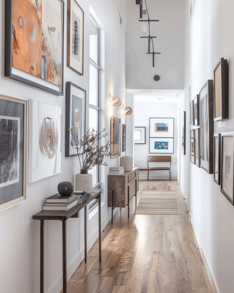 Ordne Bilder bewusst unregelmäßig an. Vertikale Linien passen gut in schmale Flure, versetzte Hängung lockert lange Wände auf. Kombiniere unterschiedliche Rahmen und Formate für Spannung. So entsteht ein starker Blickfang statt starrer Galerieoptik. Achte auf ausreichend Abstand zwischen den Werken, damit jedes wirken kann.
